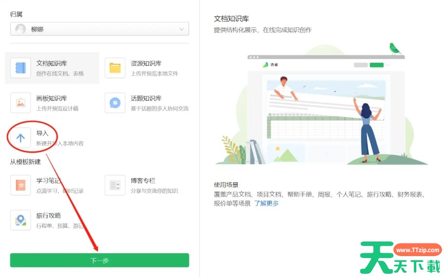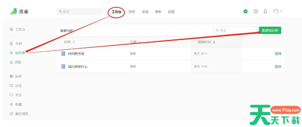 语雀是一款专业好用的云端知识库软件,那么语雀怎么加入知识库?语雀加入知识库的方法?下面就让天天下载Ttzip给大家解答下吧! 语雀怎么加入知识库? 1、打开语雀网页,注册账号并登录,打开工作台,点击新建知识库。 2、然后就可以导入已经编辑好的文档了。 3、若您还没有编辑文档,也可以选择文档知识库,选择在线创作即可。 以上就是天天下载Ttzip为您整理的语雀怎么加入知识库?语雀加入知识库的操作流程啦,希望能帮到您。 除特别注明外,本站所有文章均为 天天下载 原创,转载请注明出处来自 https://www.ttzip.com/211983.html