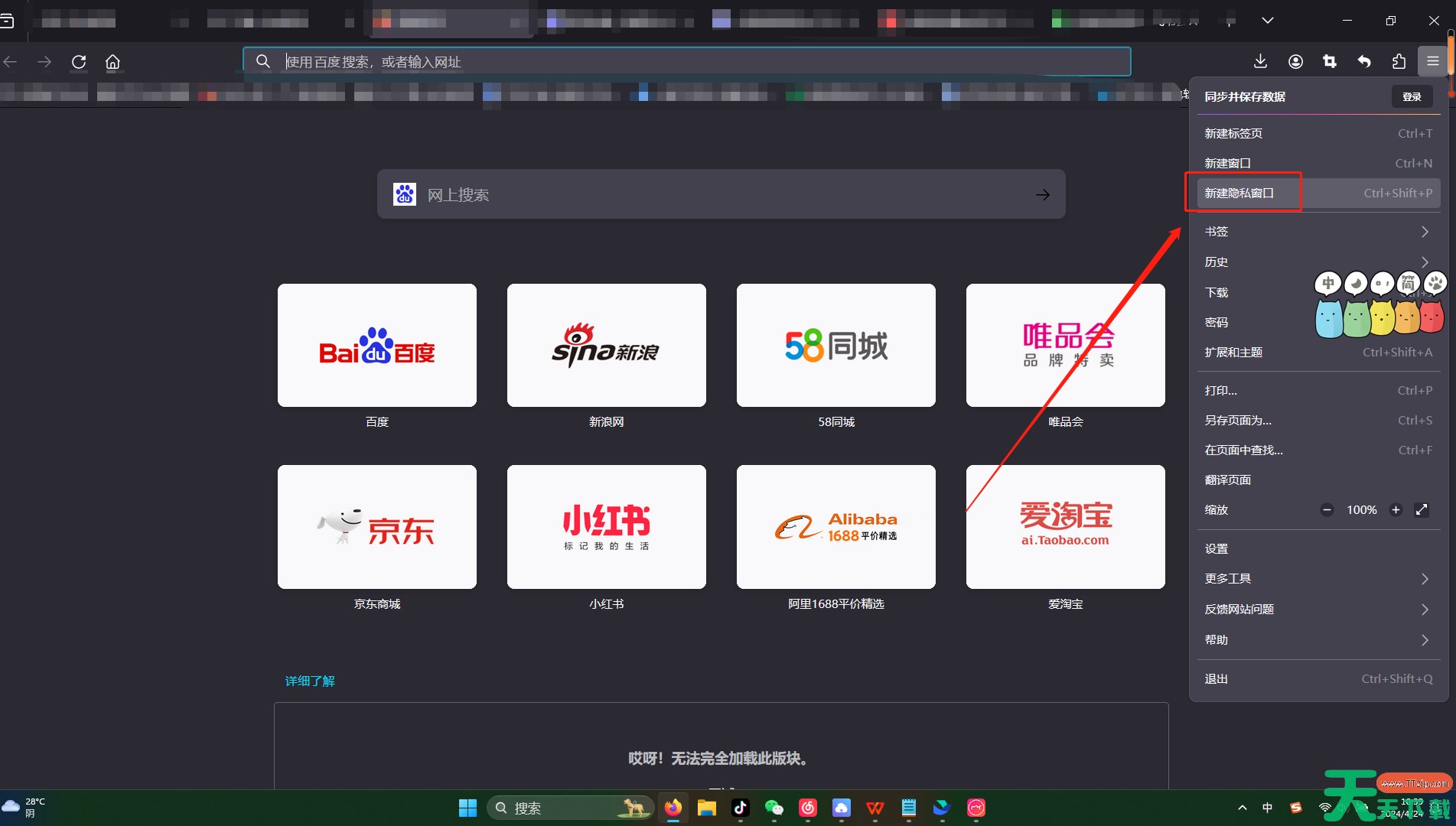 3、如下图所示,此时我们就成功打开火狐浏览器的无痕窗口了,通过该窗口访问的所有网页都不会留下任何浏览痕迹了,如图所示。