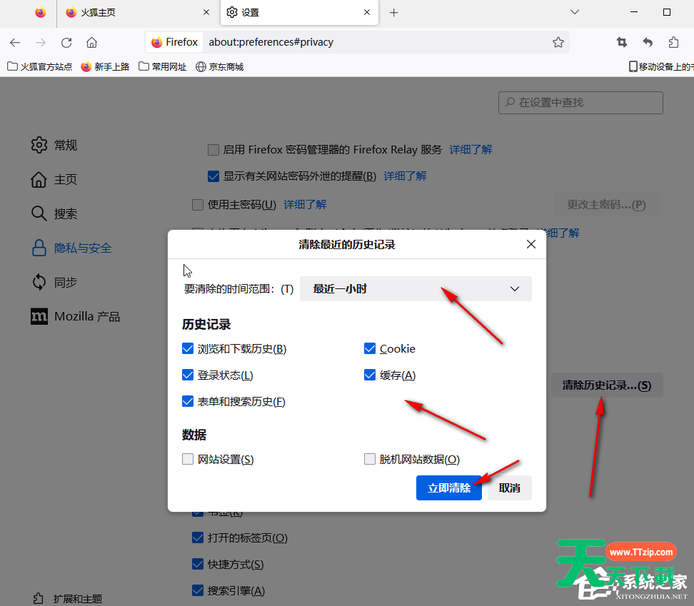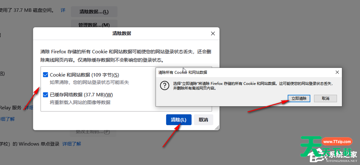 第四步:在打开的新窗口中点击勾选需要清除的数据后点击“清除”,弹出提示窗口后点击“立即清除”;