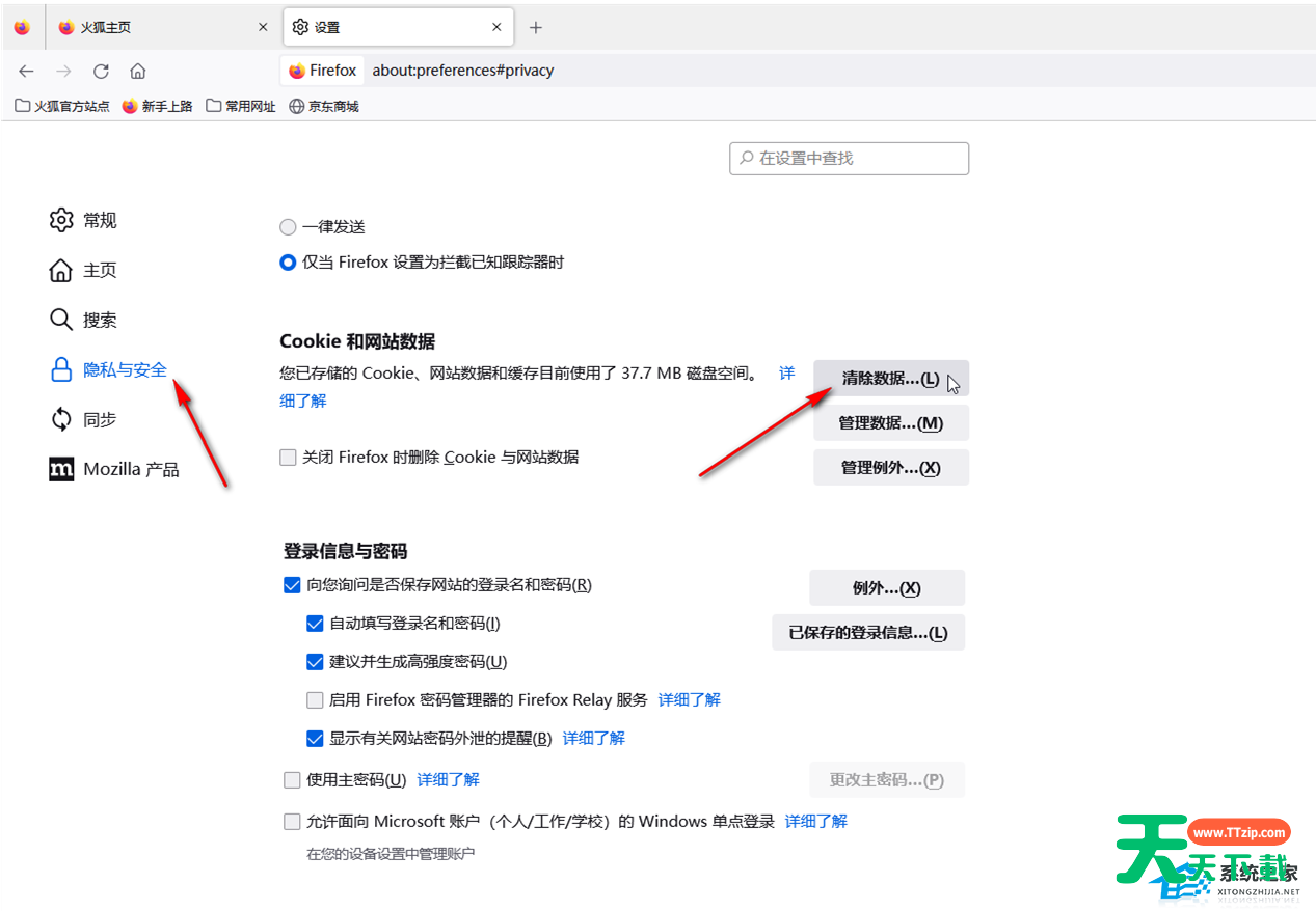第三步:在打开的窗口中点击切换到“隐私与安全”栏,滑动鼠标滚轮找到“cookie 和网站数据”处,点击“清除数据”;
