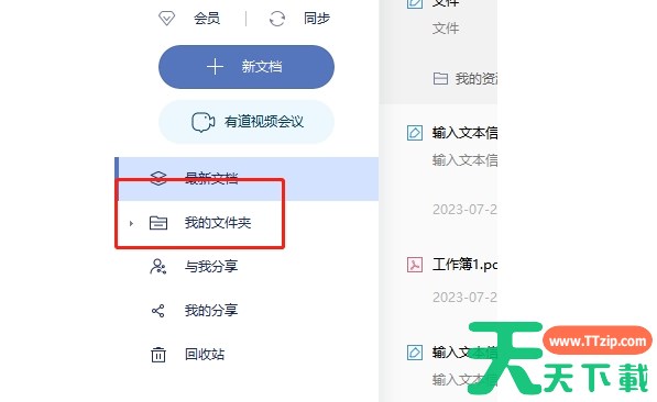 打开有道云笔记软件并来到主页。在左侧选项卡中点击“我的文件夹”,以查看文件信息。