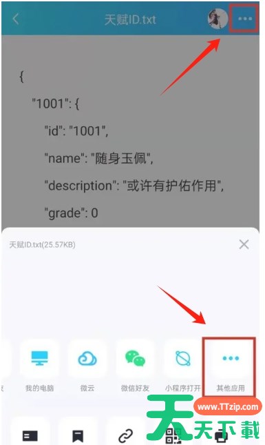 1、在聊天界面中找到并点击要打开的文件,打开文件后,点击右上角三个杠的图标,选择“用其他应用打开”。
