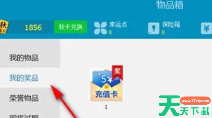 在物品箱中,点击“我的奖品”。这里会显示你赢得的所有奖品,包括话费充值卡。