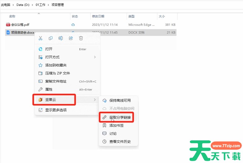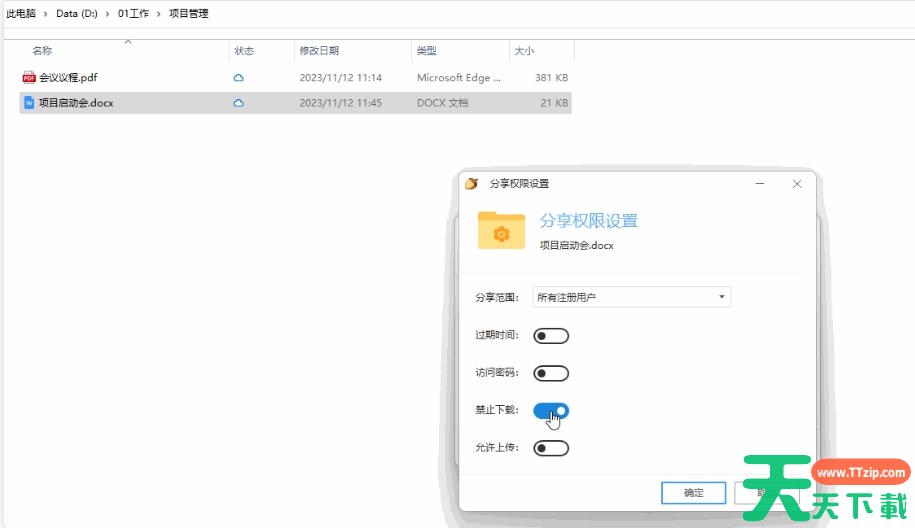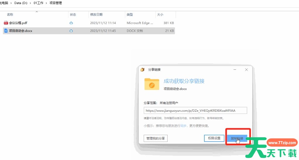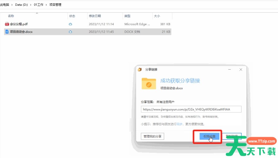 通过坚果云,用户可以将文件分享给他人,并设置分享权限、有效期等。那么坚果云怎么共享文件给别人?坚果云共享文件的方法?下面就让天天下载Ttzip给大家解答下吧! 坚果云怎么共享文件给别人? 1、选中需要分享的文件或文件夹,右键点击“获取访问链接”。 2、在弹出的对话框内,选择“权限设置”。 3、然后可以设置分享范围、过期时间、访问密码及上传下载的权限等。设置好了点击“确定”按钮。 4、然后“复制链接”就能获得一串分享链接,将它发送给想要分享的人即可。 以上就是天天下载Ttzip为您整理的坚果云怎么共享文件给别人?坚果云共享文件的操作流程啦,希望能帮到您。 除特别注明外,本站所有文章均为 天天下载 原创,转载请注明出处来自 https://www.ttzip.com/212049.html