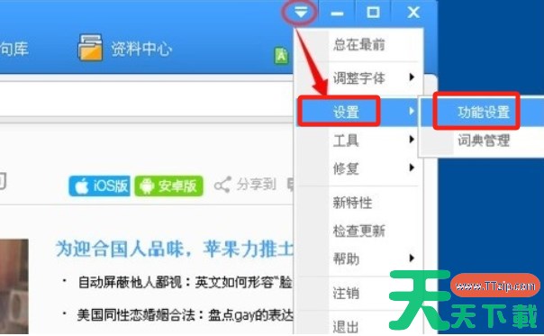 1、打开金山词霸软件,进入其主界面,在主界面的右上角,类似“倒三角”的标志,点击“设置”,然后再点击“功能设置”。