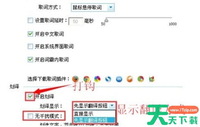 4、接下来,可以设置划译的方式,比如先显示翻译按钮还是直接显示翻译结果,以及是否选择无干扰模式等。