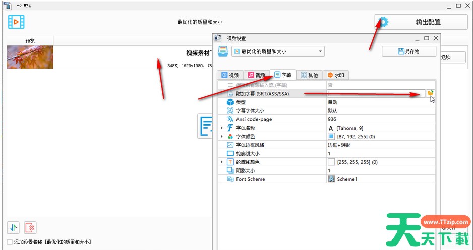 第二步:导入后点击“输出配置”,切换到“字幕”栏后,点击“附件字幕”右侧的栏,出现文件夹图标后点击一下,导入字幕文件;