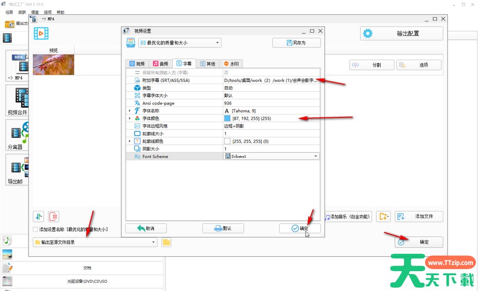 第三步:导入后可以适当设置字幕字体大小颜色等参数,然后点击“确定”回到上一个窗口,在左下角可以设置添加字幕后的视频保存位置,然后点击“确定”;