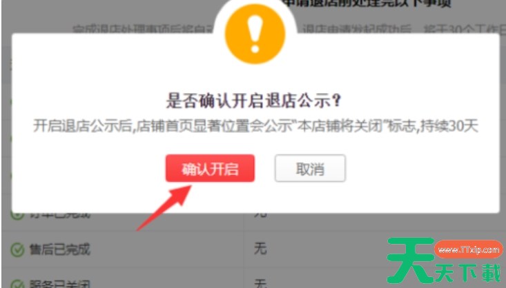 进入退店申请后,若商家决定继续退店,需点击“开启退店公示”。