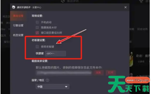 腾讯手游助手是一个在电脑上畅玩手游的模拟器平台,那么腾讯手游助手怎么隐藏鼠标指针?腾讯手游助手隐藏鼠标指针的方法?下面就让天天下载Ttzip给大家解答下吧! 腾讯手游助手怎么隐藏鼠标指针? 1、在模拟器窗口的右上角,点击进入三条杠图标。 2、在打开的列表中点击进入设置中心。 3、在基础设置中找到老板键选项。 4、勾选老板键并设置相应的按键,保存后即可使用该键来切换鼠标的显示与隐藏状态。 以上就是天天下载Ttzip为您整理的腾讯手游助手怎么隐藏鼠标指针?腾讯手游助手隐藏鼠标指针的操作流程啦,希望能帮到您。 除特别注明外,本站所有文章均为 天天下载 原创,转载请注明出处来自 https://www.ttzip.com/212146.html