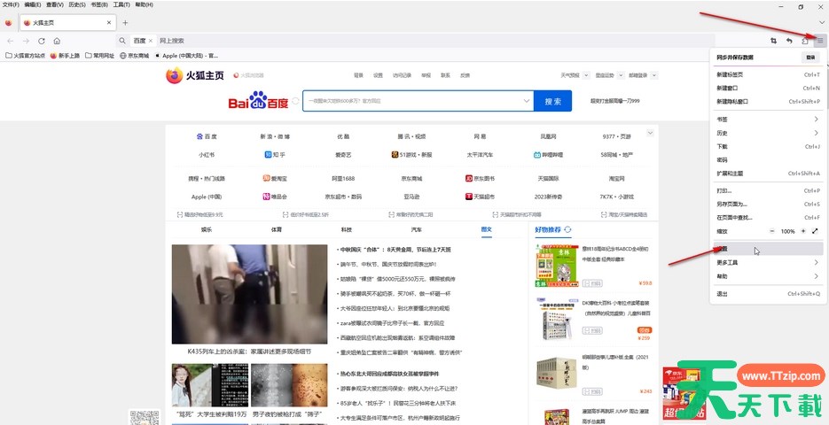 第一步:双击打卡火狐浏览器,在界面右上方点击如图所示的三条横线图标,在展开的子选项中点击“设置”;