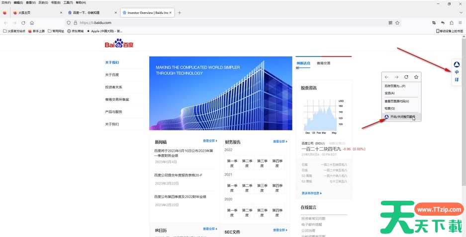 第五步:添加后刷新网页,打开一个英文网页,比如可以点击进入百度首页后在左下角点击“about baidu”打开英文网页,在界面中右键点击一下后选择“开启/关闭整页翻译”,就可以进行翻译了,点击一下出现的翻译图标,可以切换翻译的语言。