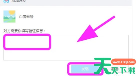在弹出的验证信息框中,输入您想要发送的【验证信息】(可选)。点击【发送】按钮,将验证信息发送给好友。等待好友在接收到验证信息后,点击【同意】按钮。好友同意,您就会收到添加好友成功的通知。