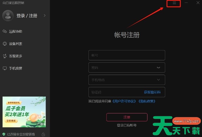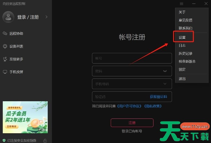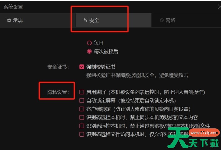 向日葵远程控制软件是一款远程控制工具,那么向日葵远程怎么设置黑屏?向日葵远程设置黑屏的操作流程?下面就让天天下载Ttzip给大家解答下吧! 向日葵远程怎么设置黑屏? 1、打开向日葵远程控制软件,点击右上角的三条横线图标。 2、在下拉菜单中,选择“设置”选项。 3、在“系统设置”页面,选择“安全”,您将看到“隐私设置”选项。 4、在“隐私设置”中,找到“启用黑屏的选项,点击该选项前的复选框,将其勾选上即可。 以上就是天天下载Ttzip为您整理的向日葵远程怎么设置黑屏?向日葵远程设置黑屏的操作流程啦,希望能帮到您。 除特别注明外,本站所有文章均为 天天下载 原创,转载请注明出处来自 https://www.ttzip.com/212349.html