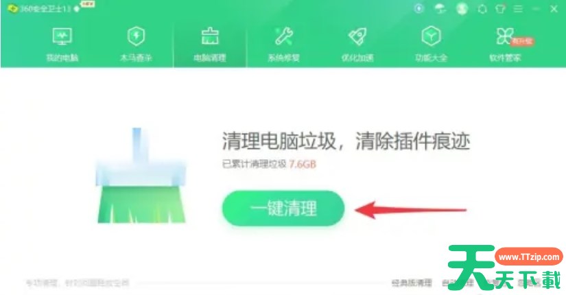 360安全卫士是一款安全软件,可以进行清理垃圾,系统修复,木马查杀,那么360安全卫士怎么一键清理垃圾?360安全卫士一键清理垃圾的方法?下面就让天天下载Ttzip给大家解答下吧!