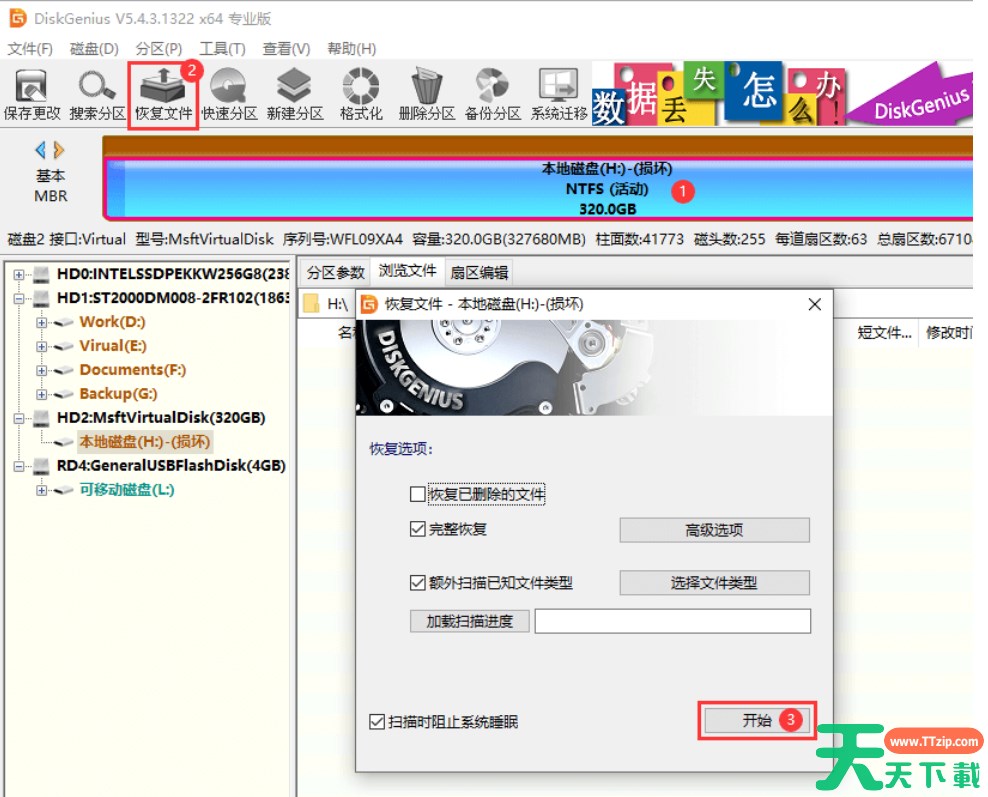 第一步: 打开diskgenius专业版,在软件里找到并选中需要恢复数据的分区,然后点击“恢复文件”按钮。等程序弹出恢复文件对话框后,点击“开始”按钮。
