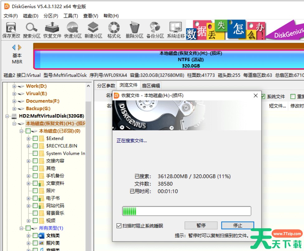 如果勾选了“额外扫描已知文件类型”选项,软件会对底层数据进行深度扫描。当扫描的分区很大且文件数量很多时,搜索需要的时间会比较长,但是可以找到更多的文件,所以需要耐心等待扫描结束。