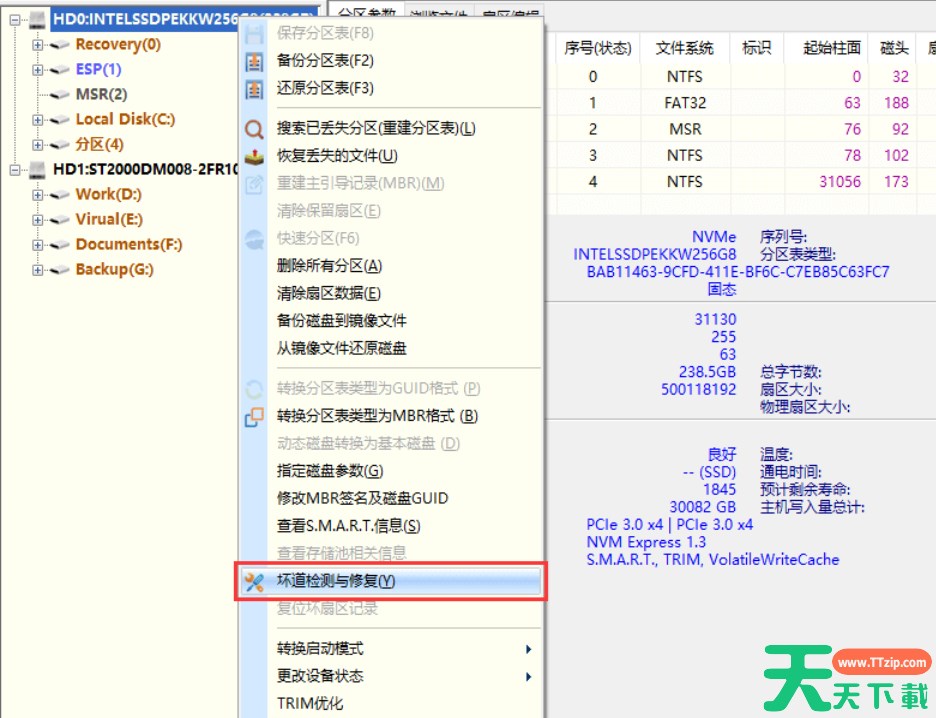 第一步、打开diskgenius软件后,右击想要检测的硬盘,然后选择“坏道检测与修复”,如下图所示: