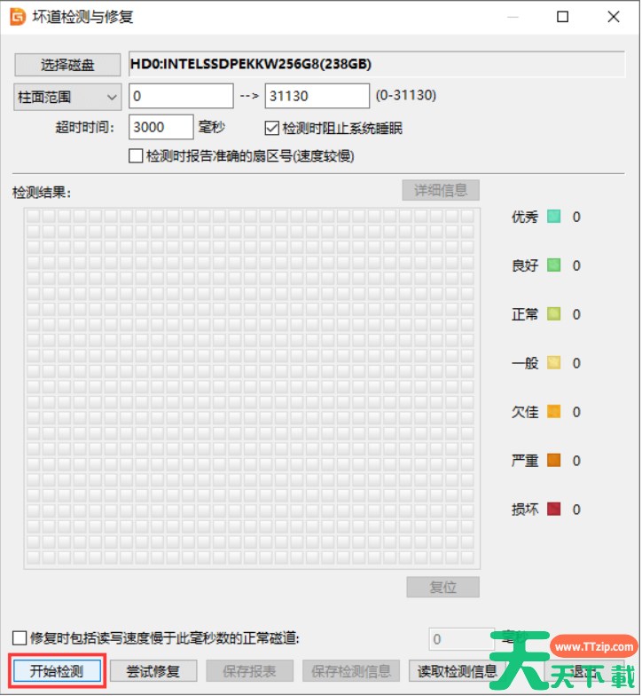 第二步、在“坏道检测与修复”窗口上,直接点击“开始检测”按钮。