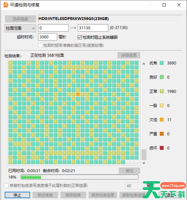 在Windows系统下检测坏道,检测速度受到其它进程的影响,在检查期间不要对被检查盘做其他操作。检查坏道所用时间具体取决于盘本身的速度和坏道情况,有的很快,有的很慢。