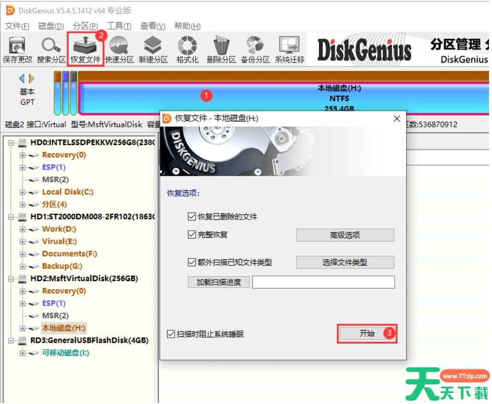 第一步、选中需要恢复Word文档的磁盘分区,点击“恢复文件”按钮。之后,在弹出的对话框上点击“开始”按钮。