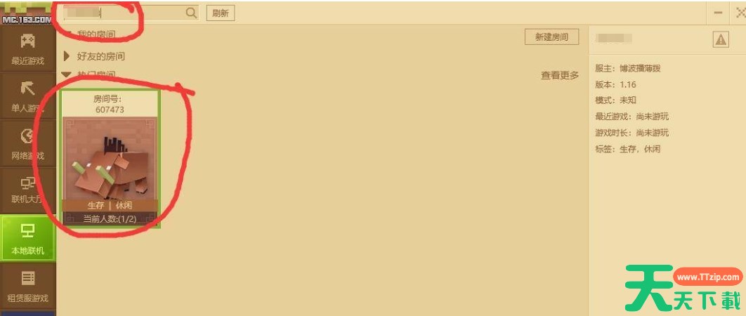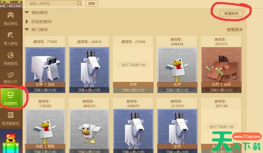 1、打开我的世界游戏平台,在游戏的主界面中,你会看到各种选项。点击“本地联机”选项,然后再点击“新建房间”。