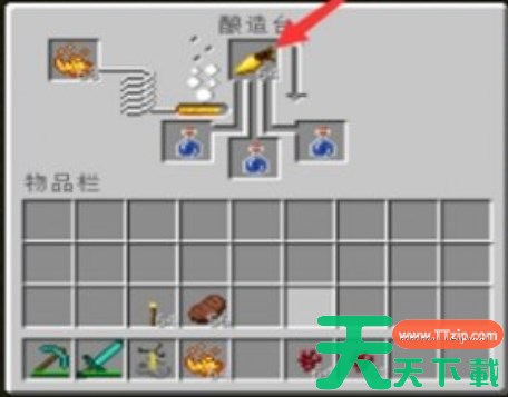 打开工作台,放入1根烈焰棒和3个原石,合成酿造台。