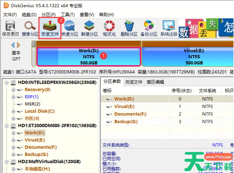 第一步:打开diskgenius软件,选中被格式化的硬盘分区,然后点击"恢复文件"按钮。