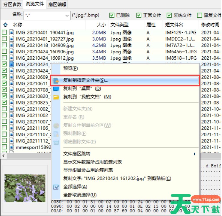 通过预览文件可以找到需要恢复的文件,勾选文件,然后右击鼠标并选择"复制到指定文件夹",如下图所示。之后,软件会弹出窗口,让选择位置来保存恢复的数据。文件复制完成后,硬盘数据恢复结束。