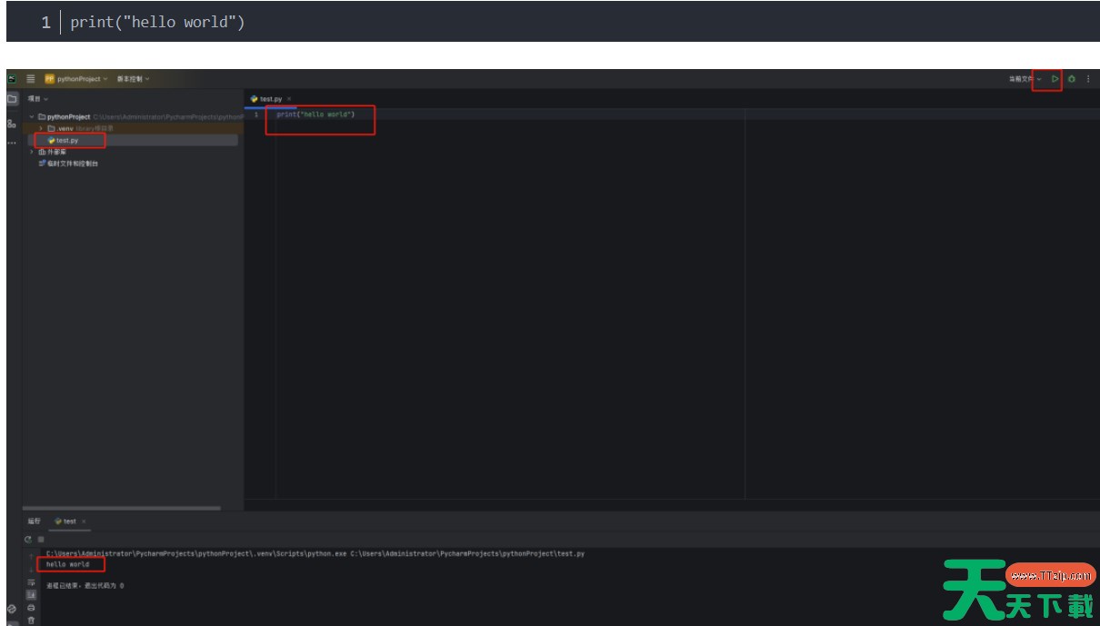 新建python项目 新建一个简单的python项目,并选择本地环境python的安装位置 运行python代码 在项目中新增一个test.py文件,并输入.点击右上角的运行按钮即可执行test.py脚本。输出信息打印在下面。 以上就是关于pycharm怎么运行的相关内容,希望对您有所帮助! 除特别注明外,本站所有文章均为 天天下载 原创,转载请注明出处来自 https://www.ttzip.com/212467.html