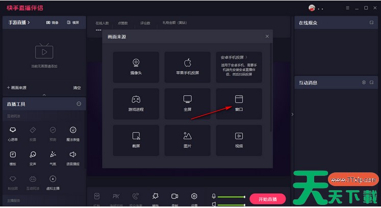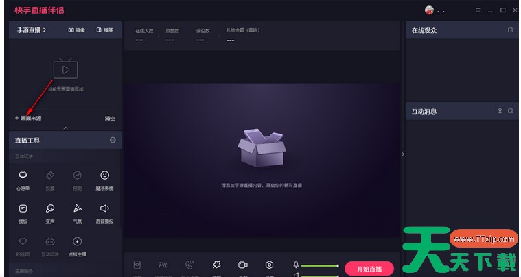 1.直接在电脑中将电脑版的快手直播伴侣点击打开,在页面左侧位置点击【画面来源】。