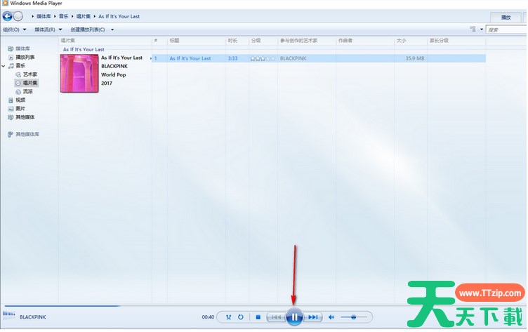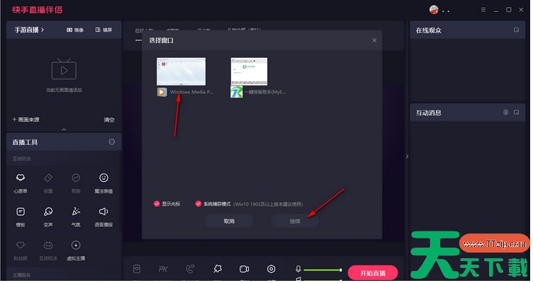 4.然后再在窗口中将正在运行的音乐播放器进行选中,然后点击下方的【继续】按钮。