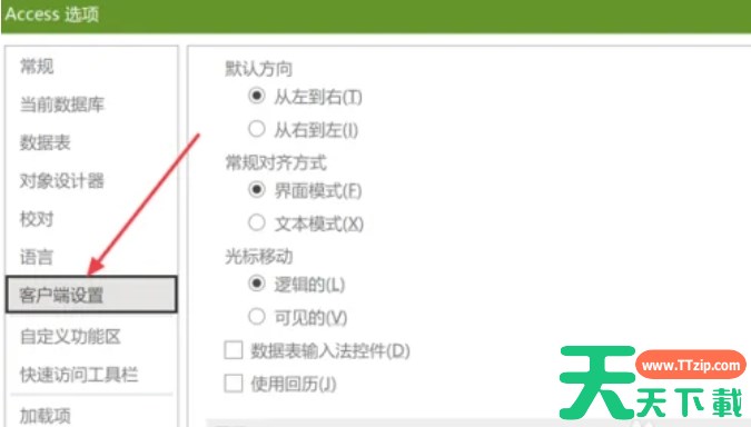 2、在“Access 选项”对话框的左侧列表中,选择“客户端设置”项。