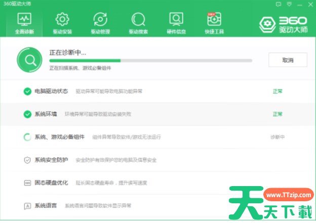 第一步:双击360驱动大师,进入首页。 第二步:点击“全面诊断”选项按钮。 第三步:等待驱动大师自动诊断。 第四步:最后即可查看系统环境情况。 以上就是天天下载Ttzip给大家带来的360驱动大师怎么检查系统环境的全部内容,希望能够帮助到大家哦。 除特别注明外,本站所有文章均为 天天下载 原创,转载请注明出处来自 https://www.ttzip.com/212481.html