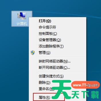 1、首先鼠标右击Win7系统桌面的计算机图标,然后选择“属性”;