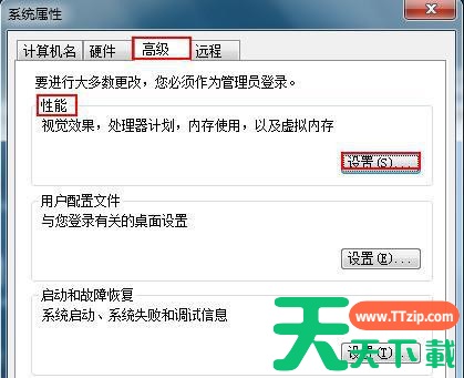 3、在弹出来的系统属性面板中,切换到“高级”选项卡,然后点击性能的“设置”按钮;