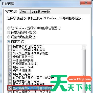 4、接着在弹出来的性能选项界面中,找到并勾选“显示缩略图,而不是显示图标”选项,然后点击“应用—确定”这样就可以了。
