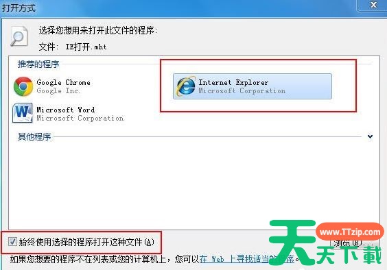 2、在推荐的程序中选择ie浏览器或者当前win7系统中其他常用的浏览器,然后将下面的“适中使用选择的程序打开这种文件”,之后mht文件就被顺利打开了。