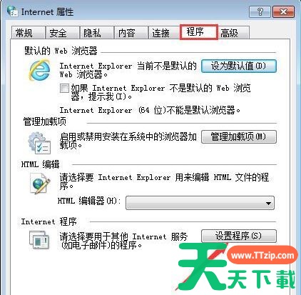 2、在Internet选项中找到“程序”这个选项卡,在改选项中点击“设置程序”;