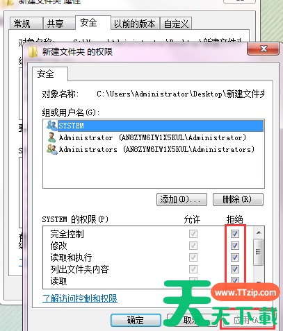 五、把右图标示的那一列全部勾选,最后点击“应用”即可获得删除的权限。