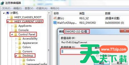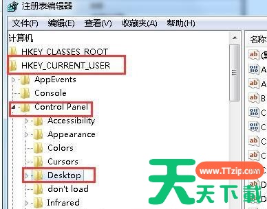 2、在注册表中依次打开HKEY_CURRENT_USERControl PanelDesktop;
