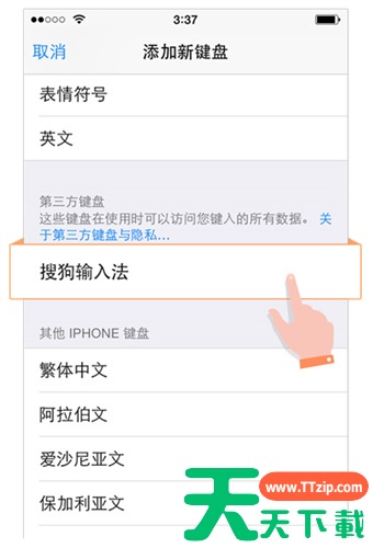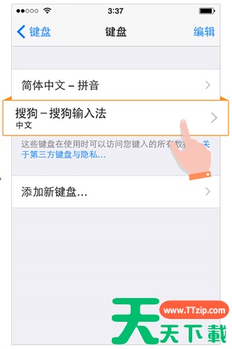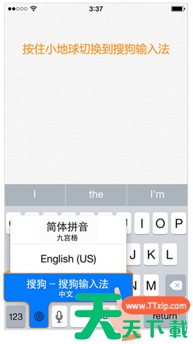 5.完成以上步骤后,回到输入界面(如:短信、备忘录),打开键盘,按住小地球,选择搜狗输入法即可。