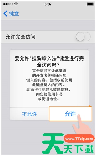 4.点击允许开启「允许完全访问」,若不开启则无法使用同步词库、图片表情、云输入等功能。