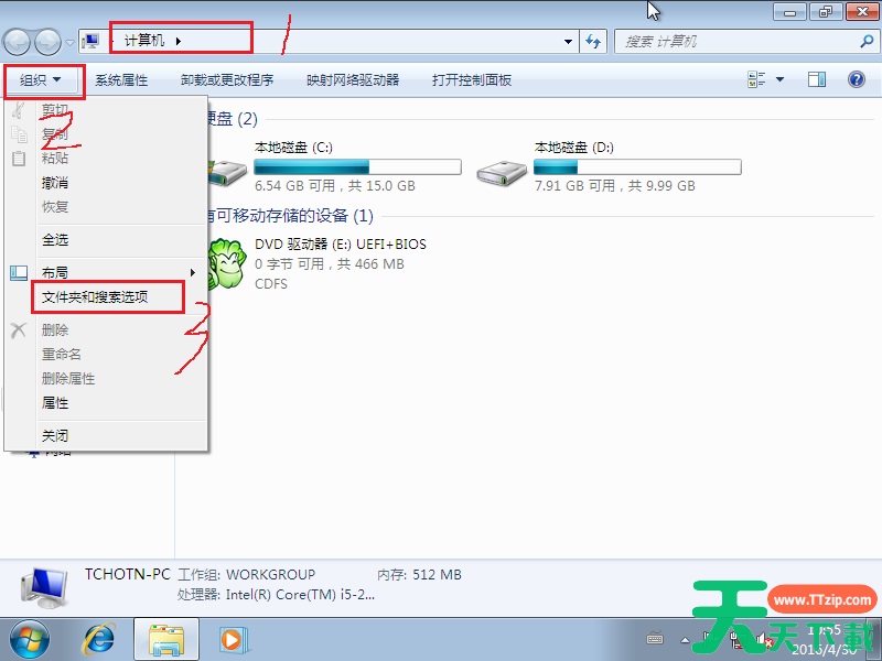 1、打开桌面上的“计算机”,然后单击“组织”,选择“文件夹和搜索选项”。
