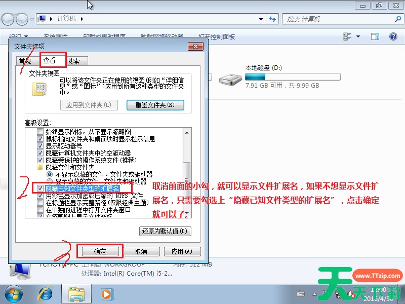 2、在弹出“文件夹选项”中点击“查看”,然后找到“隐藏已知文件类型的扩展名”,取消前面的小勾,单击“确定”。