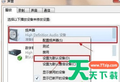 2、在声音的窗口里面选择扬声器,并右键菜单中选择“设置为默认设备”,最后按“确定”按钮即可。