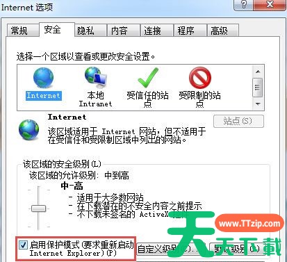 2、在打开的internet选项界面中,切换到“安全”选项卡,然后勾选“启用保护模式”;