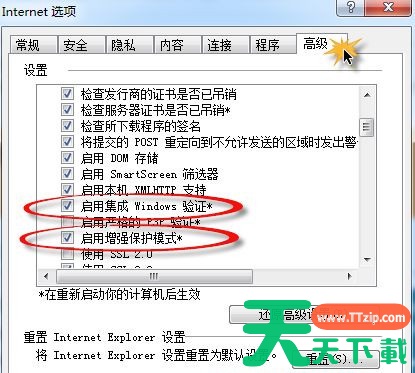 2、接着在切换到“高级”选项卡下,勾选“启用集成windows验证”和“启用增强保护模式”两项,然后点击确定按钮保存退出即可。