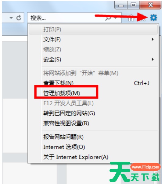 7,另外,还有一个打开【管理加载项】界面的方法,就是打开IE浏览器后,在右上角点击红色箭头所指的齿轮形态的图标。在出现的下拉菜单中,点击【管理加载项】,就可以打开其界面,随后便可以进行相关操作。