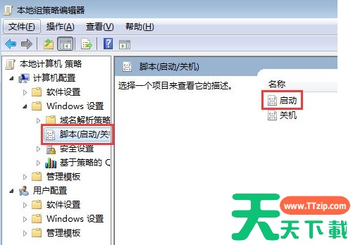 2、在打开的窗口左侧菜单中依次点击展开计算机配置—windows设置—脚本(启动/关闭),然后在右侧双击启动。